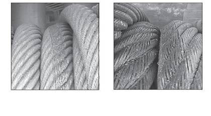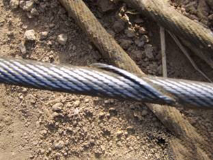 性能特點(diǎn):多層股防旋轉(zhuǎn)耐磨損,金屬填充系數(shù)大,破斷拉力高,具有平滑的外表面,提供卓越的抗磨損性能,具有優(yōu)良的阻旋轉(zhuǎn)性能;不錯(cuò)的抗擠壓性和柔韌性.例如直徑36MM的繩子,最小破斷拉力在1040KN,正常規(guī)范操作下可打七八千米的樁!適用徐工,三一重工,中聯(lián)重科等機(jī)型!(優(yōu)先推薦大廠品牌質(zhì)量過硬) 另有多股結(jié)構(gòu)防旋轉(zhuǎn)35Wx7-IWRC 強(qiáng)度等級(jí)1960和6股繩 6x36WS-IWRC常用直徑28mm .30mm.32mm.36mm.40mm等 旋挖鉆機(jī)鋼絲繩使用工況復(fù)雜多變,對(duì)鋼絲繩使用性能要求高,優(yōu)繩善用才能使用戶獲得最大收益1 鋼絲繩解卷以及安裝時(shí),為防止對(duì)鋼絲繩捻制結(jié)構(gòu)造成損傷,應(yīng)采用正確的方法,以防止鋼絲繩扭結(jié);另外,在將鋼絲繩纏繞至設(shè)備卷筒時(shí),注意不要使鋼絲繩表面沾上沙土,以免加劇磨損,影響到鋼絲繩的壽命。 正確的放繩方式 發(fā)生扭結(jié)2 整卷鋼絲繩使用時(shí)如需要截?cái)啵瑧?yīng)在截?cái)嗲皩⒔財(cái)嗖课粌蓚?cè)鋼絲繩用鐵絲綁扎牢固,尤其對(duì)于多層股抗旋轉(zhuǎn)鋼絲繩,有條件的情況下可將鋼絲繩熔斷。 鐵絲綁扎 端部熔斷3在進(jìn)行繩卡安裝時(shí),所有繩卡的馬鞍形應(yīng)和鋼絲繩長(zhǎng)端相接觸,而U形螺栓應(yīng)當(dāng)和鋼絲繩的環(huán)狀端相接觸。任何一個(gè)繩卡的馬鞍形或U形螺栓不符合上述排列原則的安裝方法都是錯(cuò)誤的.4鋼絲繩捻向選擇應(yīng)使在卷筒最底層鋼絲繩纏繞方式符合下圖5 旋挖鉆機(jī)鋼絲繩在卷筒上纏繞時(shí)應(yīng)排列整齊,不允許亂繞,否則將造成鋼絲繩工作中產(chǎn)生嚴(yán)重?cái)D咬及壓傷,影響鋼絲繩使用壽命。6股鋼絲繩產(chǎn)生擠壓損傷6 新繩經(jīng)過“磨合”可提高鋼絲繩使用壽命;同時(shí)鋼絲繩使用中也需要盡可能勻速、緩慢承載、卸載,避免過大的沖擊載荷對(duì)鋼絲繩造成損傷7 旋挖鉆機(jī)鋼絲繩使用應(yīng)特別注意在下鉆過程中準(zhǔn)確計(jì)算距離,不得過度放繩,防止鋼絲繩在松弛狀態(tài)下交繞而導(dǎo)致結(jié)構(gòu)破壞使整根鋼絲繩報(bào)廢。松弛狀態(tài)下交繞8 旋挖鉆機(jī)鋼絲繩在使用中發(fā)生“咬繩”是旋挖鉆機(jī)工作中經(jīng)常見到的特殊情況,建議在使用中對(duì)“咬繩”部位經(jīng)常檢查并加強(qiáng)潤(rùn)滑,如果鋼絲繩最終報(bào)廢的原因是由于“咬繩”造成鋼絲繩斷絲、斷股所導(dǎo)致,則需要對(duì)卷筒進(jìn)行改進(jìn),或者加長(zhǎng)鋼絲繩訂貨長(zhǎng)度在使用中進(jìn)行截繩操作,避免同一部位長(zhǎng)時(shí)間 “咬繩”而早期報(bào)廢。“咬繩”導(dǎo)致鋼絲繩早期報(bào)廢9 斷絲處理當(dāng)旋挖鉆機(jī)鋼絲繩出現(xiàn)斷絲仍需進(jìn)行使用時(shí),應(yīng)將斷絲及時(shí)處理。可以用鋼絲鉗夾住斷絲頭部,前后反復(fù)彎折至鋼絲斷掉。經(jīng)過這樣處理,鋼絲斷頭將被夾緊在股繩之間,不會(huì)對(duì)鋼絲繩使用造成危害. 斷絲處理 處理后10.鋼絲繩割斷旋挖鉆機(jī)鋼絲繩割斷時(shí),請(qǐng)?jiān)阡摻z繩的割斷處兩邊用鐵絲扎緊,防止鋼絲繩松散,散股,造成鋼絲繩局部斷絲斷股