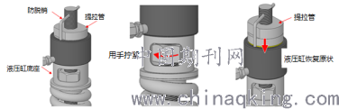0 引言 隨著我國經(jīng)濟(jì)建設(shè)的不斷發(fā)展,高層建筑大量出現(xiàn),作為運(yùn)行工具,電梯必不可少。連接在轎廂和對(duì)重上的鋼絲繩在電機(jī)的帶動(dòng)下拖動(dòng)轎廂運(yùn)行,它是承受轎廂與對(duì)重重量、傳輸運(yùn)行動(dòng)力的重要部件,它的運(yùn)行情況關(guān)系到電梯的舒適感、鋼絲繩和繩輪的使用壽命以及電梯的運(yùn)行安全,是需要密切關(guān)注的部件。 根據(jù)載重量或型號(hào),不同的電梯含有不同數(shù)量的曳引鋼絲繩,共同承受電梯轎廂與對(duì)重的重量,各鋼絲繩之間的張力差成為影響鋼絲繩運(yùn)行情況的重要因素,《GB/T 10060 電梯安裝驗(yàn)收規(guī)范》(2011)規(guī)定:“任何一根繩或鏈的張力與所有繩或鏈之張力平均值的偏差不能大于5%”,怎樣便捷快速地調(diào)整鋼絲繩的張力使其符合要求成為工程人員面臨的重要問題。 1 鋼絲繩張力調(diào)整的現(xiàn)狀 圖1為鋼絲繩繩頭側(cè)圖示,鋼絲繩的繩頭側(cè)會(huì)安裝繩頭彈簧或橡膠,由于新出廠的繩頭彈簧/橡膠的彈性系數(shù)基本相等,因此其受力后的高度可以間接反映出所受到的力的大小。傳統(tǒng)的鋼絲繩調(diào)整方法就是利用繩頭彈簧/橡膠的高度差來判斷其張力差,考慮到各彈簧/橡膠存在個(gè)體微小差異,因此允許各彈簧/橡膠存在一定的高度差,一般要求高度差不超過2mm。 使用傳統(tǒng)方法調(diào)整鋼絲繩張力的步驟如下: (1)使用螺絲刀插入相互間距很小的繩頭錐套孔,如圖2所示,阻擋螺絲刀轉(zhuǎn)動(dòng),從而防止鋼絲繩發(fā)生轉(zhuǎn)動(dòng),之后將繩頭側(cè)的防轉(zhuǎn)鋼絲繩拆掉; (2)旋松鎖緊迫母,之后根據(jù)各繩頭彈簧的高度差,對(duì)每根鋼絲繩的調(diào)整螺母進(jìn)行調(diào)緊與調(diào)松作業(yè),使其高度差符合調(diào)整要求。 (3)旋緊鎖緊迫母,安裝防轉(zhuǎn)鋼絲繩,取出繩頭錐套孔中的螺絲刀。 以上傳統(tǒng)操作方法通俗易懂,但也存在一定的缺點(diǎn): (1)當(dāng)鋼絲繩長期處于張力不均時(shí),繩頭彈簧/橡膠的彈性系數(shù)會(huì)發(fā)生較大變化甚至產(chǎn)生永久變形,此時(shí)僅依靠繩頭高度差進(jìn)行判斷就不能準(zhǔn)確反映張力情況; (2)電梯有多根鋼絲繩承重,當(dāng)調(diào)整其中一根時(shí),就會(huì)對(duì)其它根產(chǎn)生影響,要使所有鋼絲繩張力相等,需要反復(fù)進(jìn)行調(diào)整,效率較低; (3)當(dāng)電梯載重量較大或者層站較高時(shí),人力逐根調(diào)整鋼絲繩會(huì)非常費(fèi)時(shí)費(fèi)力。 綜合以上特點(diǎn),傳統(tǒng)調(diào)整方法存在精度差,效率低及費(fèi)力的缺點(diǎn),此時(shí)就需要一種較為準(zhǔn)確的調(diào)整鋼絲繩張力的工具或方法。 2 鋼絲繩張力調(diào)整裝置設(shè)計(jì)與解析 根據(jù)以上傳統(tǒng)調(diào)整鋼絲繩的方法中不能同時(shí)精確調(diào)整的缺點(diǎn),結(jié)合液壓的特點(diǎn),設(shè)想是否可以利用液壓原理進(jìn)行調(diào)整工具的設(shè)計(jì)。 2.1 設(shè)備原理 若將相互連通的液壓缸安裝在繩頭側(cè),使每根鋼絲繩的拉力作用在液壓缸上,則每個(gè)液壓缸所受到的壓力應(yīng)該都是相同的?;谠撛恚疚脑O(shè)計(jì)了一種液壓型的鋼絲繩張力調(diào)整器,其基本結(jié)構(gòu)由液壓泵,液壓缸、鋼絲繩防轉(zhuǎn)裝置以及其它附件組成,原理如圖3所示。通過在鋼絲繩端部的彈簧座上設(shè)置液壓缸,液壓泵加壓使各液壓缸全部升起時(shí),各液壓缸活塞所受的壓力相同,將各繩頭錐套桿以均等的力提拉,從而使各鋼絲繩的張力保持一致,收緊調(diào)整螺母和迫緊螺母,調(diào)整完成。 2.2 設(shè)備操作要點(diǎn) 以1:1吊掛的電梯為例,在使用本文中的鋼絲繩張力調(diào)整裝置時(shí),相關(guān)操作要點(diǎn)及步驟如下: (1)在轎廂側(cè)/對(duì)重側(cè)安裝鋼絲繩防轉(zhuǎn)裝置,以防作業(yè)過程中出現(xiàn)鋼絲繩轉(zhuǎn)動(dòng)進(jìn)而使鋼絲繩從繩頭板中脫出,如圖4。 (2)稍微擰松鎖緊迫母,將液壓缸底座、液壓缸依次放在彈簧座上,之后用可以壓緊液壓缸活塞的帶螺紋的提拉管進(jìn)行鎖緊,在繩頭螺桿上安裝防脫銷。如圖5。 (3)使用液壓泵對(duì)液壓缸進(jìn)行加壓,當(dāng)所有液壓缸的活塞都升起時(shí)且提升高度均小于(不能等于)活塞的提升范圍時(shí),說明各鋼絲繩張力調(diào)整均勻。 (4)作業(yè)人員用手通過液壓缸底座小窗向下旋緊調(diào)整螺母及鎖緊迫母,之后拆掉防脫銷、提拉管以及液壓缸和液壓缸底座,裝回防轉(zhuǎn)鋼絲繩。 注意:液壓缸加壓時(shí),可能會(huì)出現(xiàn)某幾個(gè)活塞已經(jīng)提升至最大行程,但仍有部分液壓缸未升起的情況,此時(shí)對(duì)于已經(jīng)提升的活塞,錐套桿會(huì)被相應(yīng)的提拉,因此調(diào)整螺母及鎖緊迫母也會(huì)被提拉,作業(yè)人員可以用手通過液壓缸底座上的小窗向下擰緊調(diào)整螺母及鎖緊迫母,如圖6,之后松開提拉管,按壓液壓缸活塞使其恢復(fù)原狀后,如圖7,再重新鎖緊提拉管,重復(fù)之前的步驟進(jìn)行加壓提升液壓缸,直至所有液壓缸活塞都升起,且行程都小于(不能等于)活塞的最大行程。 2:1吊掛的電梯在轎廂和對(duì)重側(cè)調(diào)整完畢后,由于中部鋼絲繩可能“積氣”,最好電梯上下運(yùn)行幾次,再重復(fù)以上步驟進(jìn)行