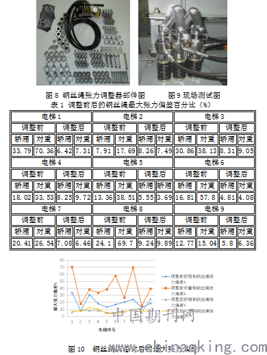 圖5 圖6 圖7 3 開發(fā)實(shí)物及測(cè)試效果 按照開發(fā)思路所設(shè)計(jì)出的鋼絲繩張力調(diào)整器及相關(guān)附件如圖8所示。 依據(jù)本文第二部分所述使用方法,使用本裝置對(duì)10臺(tái)電梯的鋼絲繩張力在轎廂和對(duì)重側(cè)分別進(jìn)行調(diào)整(先調(diào)整一側(cè),再調(diào)整另一側(cè)),調(diào)整后使用張力計(jì)對(duì)各鋼絲繩張力進(jìn)行測(cè)試,本測(cè)試旨在驗(yàn)證本套設(shè)備的有效性,因此對(duì)轎廂和對(duì)重側(cè)只進(jìn)行了一次調(diào)整,并未使電梯運(yùn)行幾次后再次進(jìn)行調(diào)整。圖9為現(xiàn)場(chǎng)調(diào)整圖,表1為各電梯調(diào)整前后各鋼絲繩張力與平均張力之間的最大偏差百分比,對(duì)應(yīng)圖示如圖10。 從表1和圖10可以得出以下結(jié)論: (1)使用鋼絲繩張力調(diào)整器進(jìn)行調(diào)整,是直接以張力大小為調(diào)整依據(jù),調(diào)整精確,張力不均的情況改善十分明顯; (2)一次可調(diào)整多條鋼絲繩,效率提高; (3)調(diào)整時(shí)以液壓為動(dòng)力進(jìn)行調(diào)整,節(jié)省人力。 需要指出的是:以上測(cè)試是一側(cè)調(diào)整后再調(diào)整另外一側(cè),由于鋼絲繩張力調(diào)整器是根據(jù)不同的張力向繩頭側(cè)提拉不同的距離來實(shí)現(xiàn)張力平衡的,當(dāng)提拉其鋼絲繩時(shí),繩輪處的鋼絲繩會(huì)發(fā)生移動(dòng)或滑動(dòng),因此后調(diào)整的一側(cè)會(huì)對(duì)先調(diào)整的一側(cè)產(chǎn)生影響,使已經(jīng)調(diào)好的一側(cè)張力發(fā)生變化。 4 總結(jié) 通過以上介紹及現(xiàn)場(chǎng)實(shí)物操作效果分析,可得出以下結(jié)論: (1)鋼絲繩張力調(diào)整器調(diào)整效果明顯,最大張力偏差下降明顯; (2)鋼絲繩張力調(diào)整器是直接調(diào)整張力大小,調(diào)整效果精確,而彈簧/橡膠高度只是張力的一種間接表現(xiàn),精度有限,是一種粗略的調(diào)整方法; (3)當(dāng)電梯鋼絲繩張力長期偏差較大時(shí),可能會(huì)超過彈簧/橡膠的彈性極限,產(chǎn)生永久變形,因此其高度不能作為精確調(diào)整的標(biāo)準(zhǔn); (4)對(duì)于張力偏差較大的鋼絲繩,人工粗略調(diào)整后,再進(jìn)行鋼絲繩張力調(diào)整器的精調(diào),會(huì)大大提高工作效率。 由于該裝置是直接調(diào)整鋼絲繩的張力,因此避免了人工通過觀察彈簧高度間接調(diào)整鋼絲繩張力所可能引起的不準(zhǔn)確;同時(shí),該裝置通過液壓缸頂起繩頭錐套桿,可以手動(dòng)輕松旋緊調(diào)整螺母,大大降低了勞動(dòng)強(qiáng)度,是鋼絲繩張力調(diào)整的有效工具。